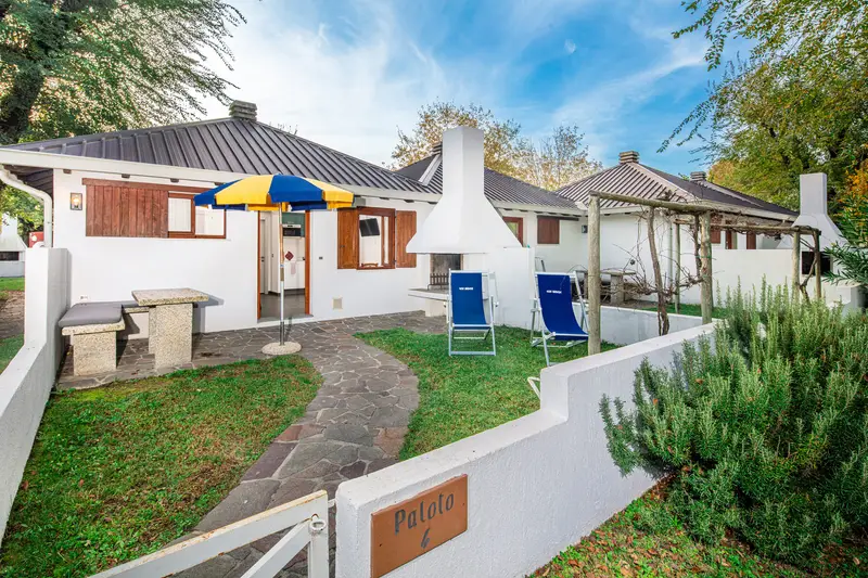 Bungalow trilocale di 36 m2 completamente rinnovato, in muratura, con giardino privato, attrezzato con barbecue, tavolo, sedie da esterno, sdraio prendisole e ombrellone. Si affacciano su giardini comuni ombreggiati e attrezzati con giochi per bambini. Arredamento moderno e confortevole: soggiorno con sofà e TV, angolo pranzo, zona cucina attrezzata con lavastoviglie, frigo con freezer, forno microonde, bollitore. Camere da letto matrimoniale e cameretta con letti singoli. Bagno con ampia doccia a pioggia, asciugacapelli, bidet, WC. La cameretta e il soggiorno sono divise solo da una parete di altezza 2,50 mt